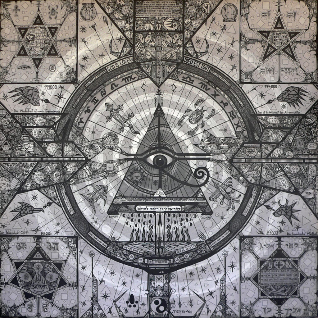 «El ojo de los cien mil dioses». Acrílico sobre lienzo. 1.50 m × 1.50 m. Imagen cortesía del artista. Procesamiento de imagen por Ojodehipopótamo.