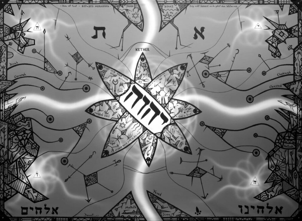 The Kabballah, esoteric or mystic Judaism, is very much about the power of symbolism, and what I see in Permut’s work is at times a highly traditional depiction of the hierarchies and meaning of the various pictograms, and at other times a more personal exploration of the potential interactions of these individual elements, giving a fresh look and inviting a new relationship. The very naming of God, to the extent that this naming can even exist or be permitted in this world within the Jewish text and belief, is equally central to Permut’s work, though as with the Kabballah, its presence may not be recognized by most viewers, but without it for the artist, his work would lose all meaning and coherence, it would lack logic and would not be whole.